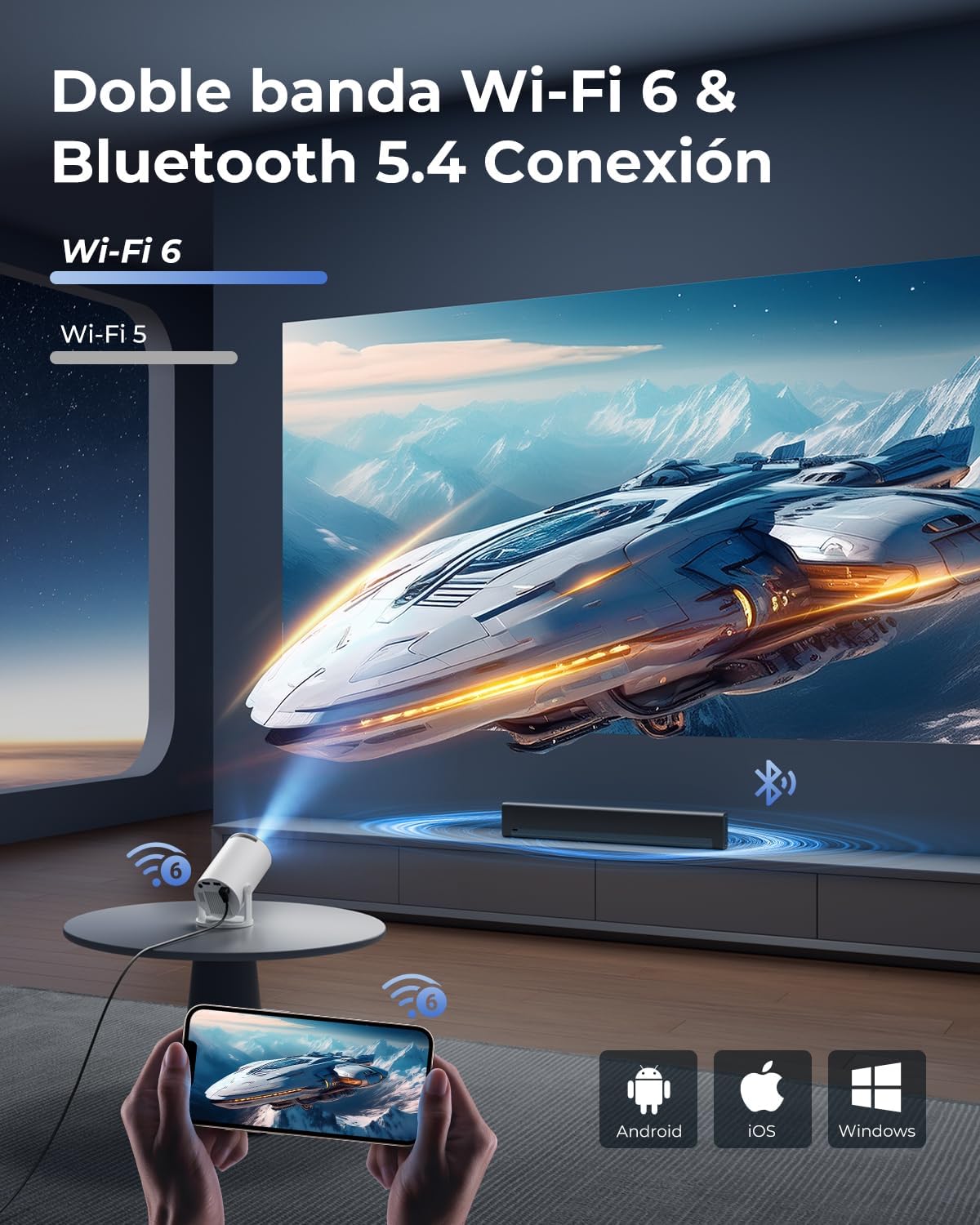 Incluye HDMI, USB, Wi-Fi y Bluetooth, lo que permite conectar fácilmente consolas, ordenadores portátiles, teléfonos móviles y otros dispositivos.