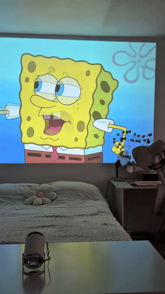 Este mini proyector me ha sorprendido. La imagen se ve nítida, con buenos colores y se ajusta sola gracias al auto keystone. Se puede girar casi como quieras, incluso proyectar en el techo, y trae Android TV con apps como Netflix o YouTube que van bastante fluidas.